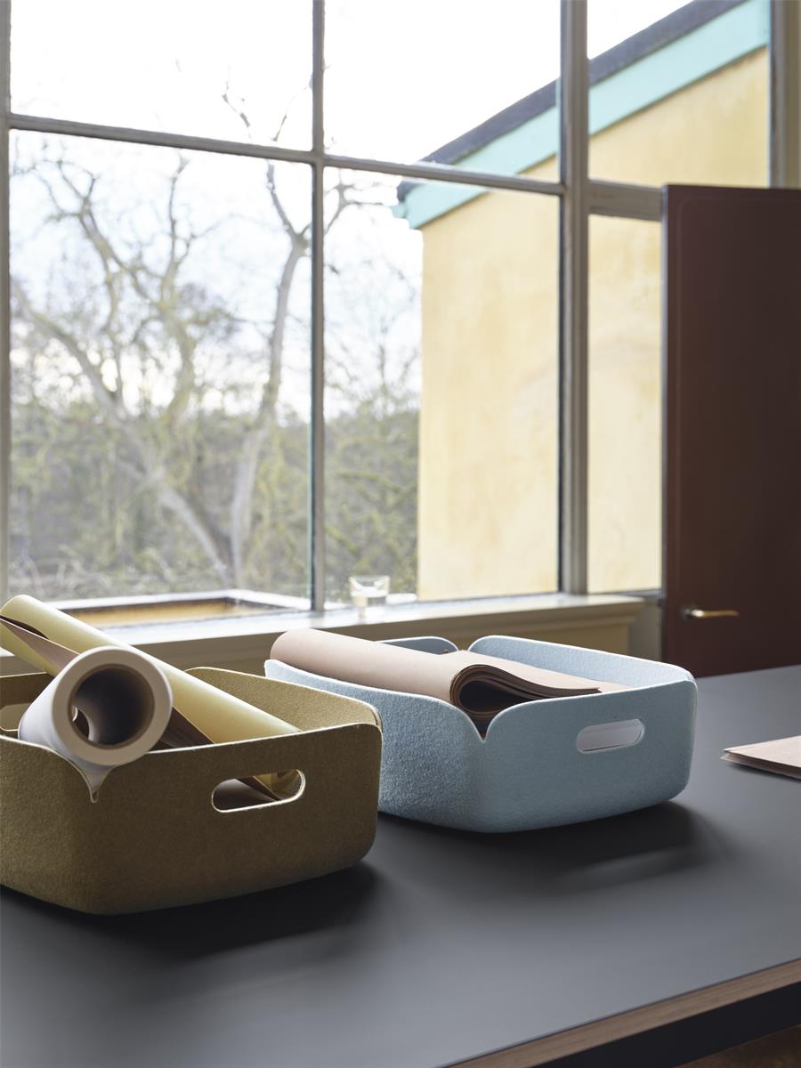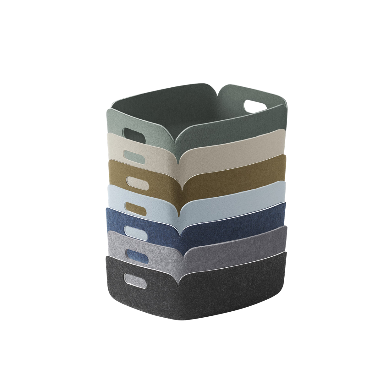 The Restore Tray brings a new perspective to modern storage, crafted in fibers made using 100% recycled plastic. Available in multiple colors, it comes in two sizes to suit various needs. The larger tray is ideal for storing documents, utensils, or toys, providing ample space with a clean design. The sleeker, flat version caters to organizing smaller items like pens and notebooks, ensuring they are neatly arranged and easily accessible.